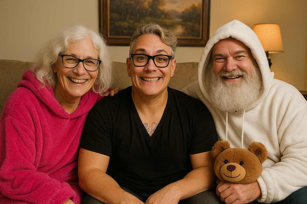 She leans back in the recliner, pinching her nose like she’s trying to escape her own face.