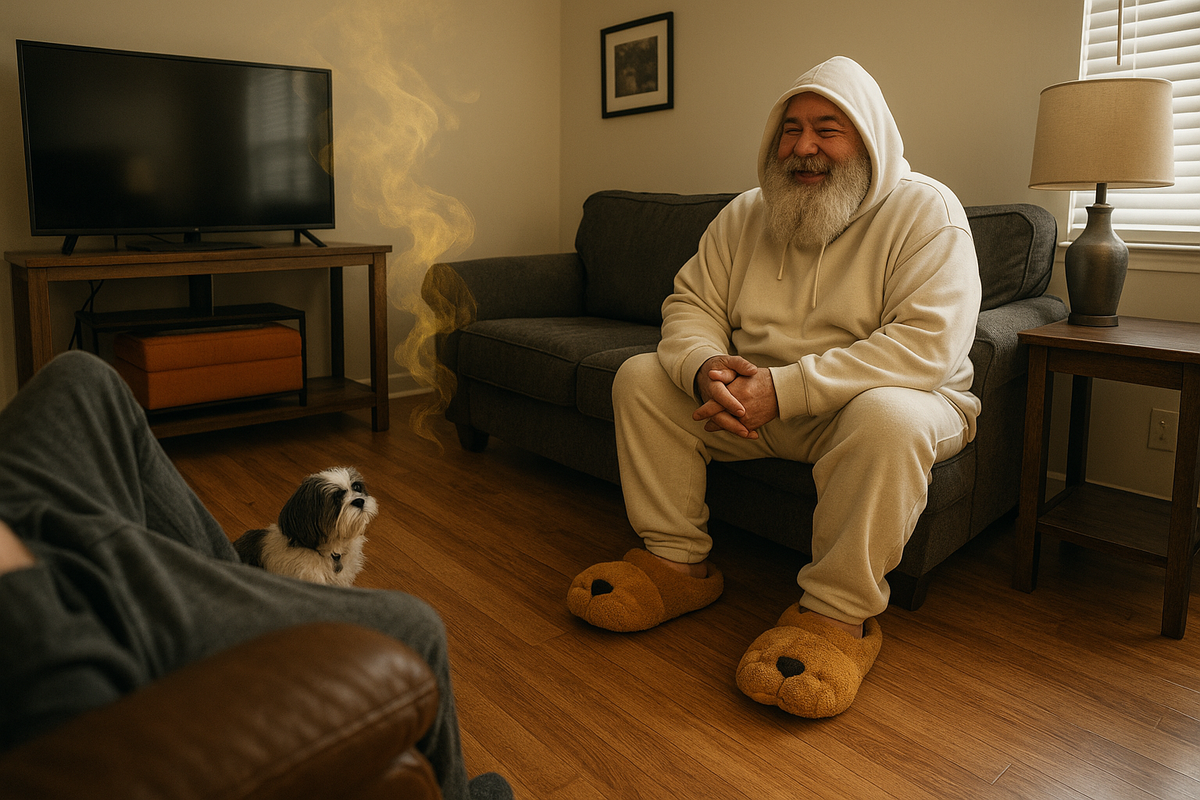 Zeke — the hairy Santa-impersonating biker prophet — stands proudly in massively overinflated, fuzzy bear slippers. They appear to be laughing. Or being stabbed by his ankles. Hard to tell.