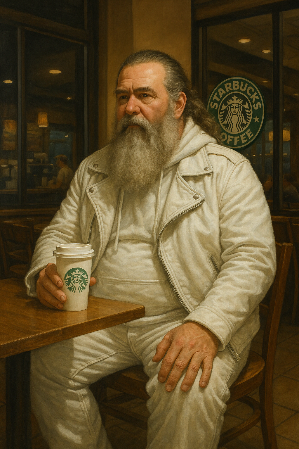 We are wearing the same pajamas we rolled out of bed in: pea-green wide-leg Aerie sweats and a black hooded sweatshirt adorned with lint and the black-pill aesthetic. Meanwhile these two heavenly jesters phase into Starbucks at 5:48 a.m. wearing hooded snuggies — comically bright, absurdly soft.